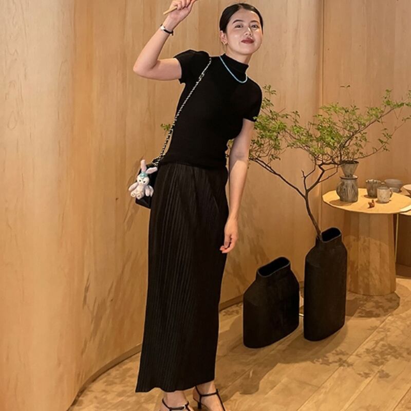 【商品名】【ボトムス】プリーツ シフォンのスリット ロングスカート