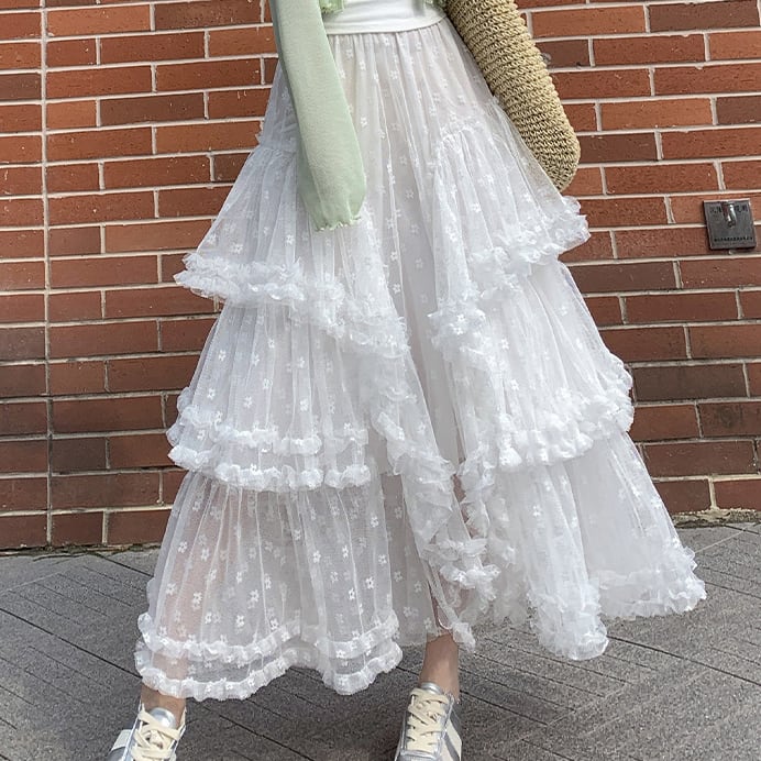 【商品名】【ボトムス】白 レース付き ティアード スカート